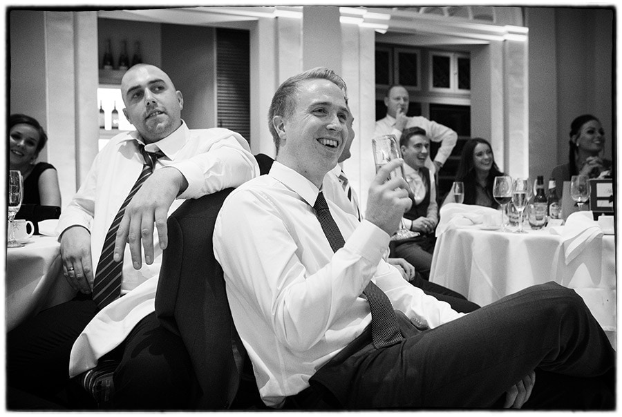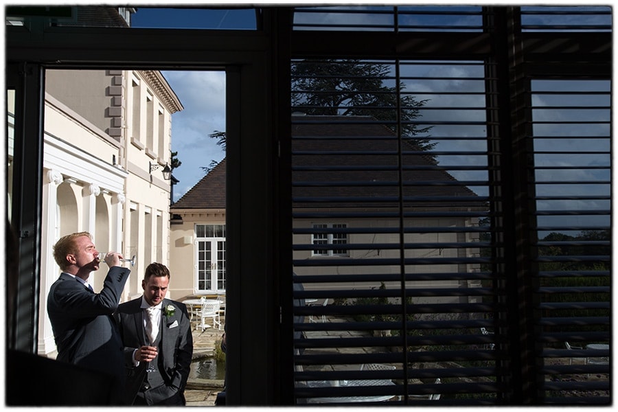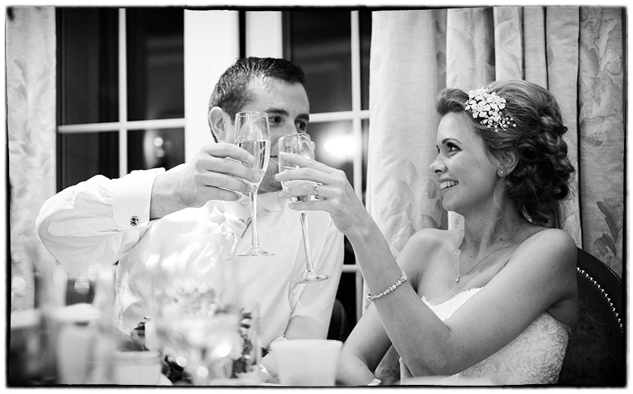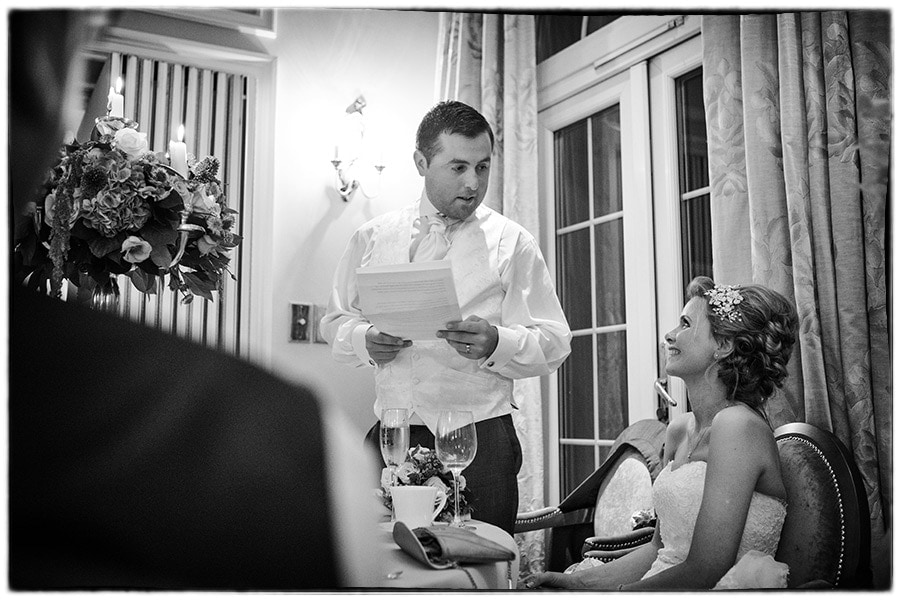 After the wedding ceremony it was a very short drive to Brockencote Hall for the wedding reception.  Sophie and Alastair waved at guests as they arrived from the Alvis parked up on front of the lake in the sunshine at Brockencote Hall. After the drinks reception I took a handful of family photographs on the patio before the call for dinner.  Speeches followed which are always great for photography.