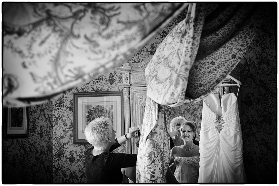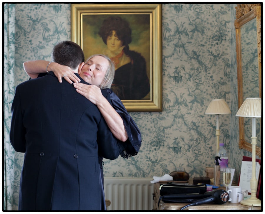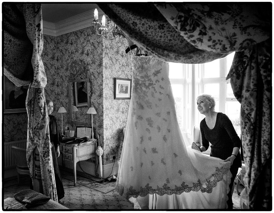 On the morning of the wedding I arrived to photograph Steve and his dad (on best man duties) getting ready before heading upstairs to catch up with Tracy. I walked into Tracy’s room and was surprised to see two beautiful dresses hanging up, this was to be a surprise for Steve who had no idea Tracy would change for the evening party.