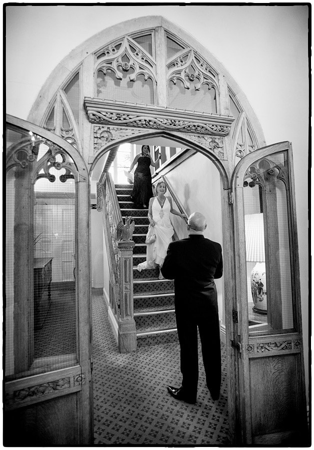 After the ceremony the couple and their guests enjoyed drinks in the Great Hall which dates back to 1537. This was followed by afternoon tea with everyone sat around one long table. There then followed a break to allow Tracy time to rest before the evening dinner. Steve waited for Tracy at he bottom of the stair case and Tracy surprised Steve with her beautiful evening dress. After dinner the evening ended with dancing.