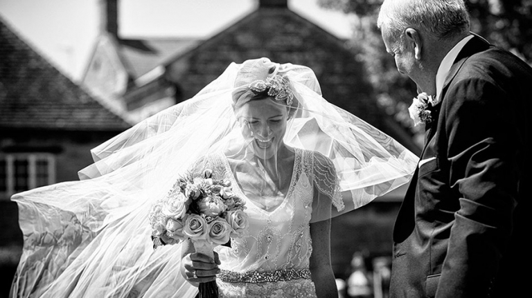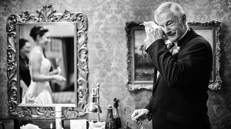In the image above I had waited for the moment when the bride’s father came into the room to see his daughter as a bride for the first time. He was overwhelmed with emotion. I needed to include the bride in the photograph as otherwise the story would not be apparent to the viewer, so I framed the bride in the mirror and by luck dad was framed by the painting behind which made the composition work. These moments often only last for seconds so as a wedding photojournalist I have to think quickly to capture the image.